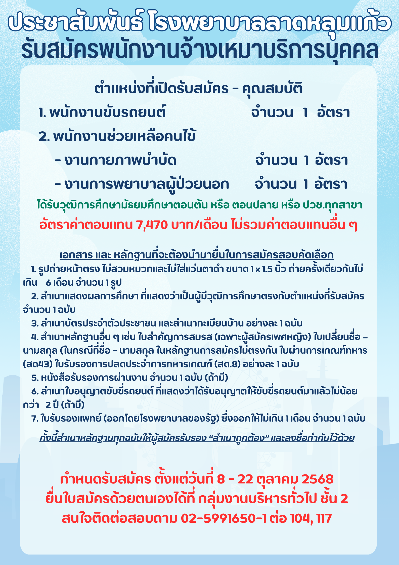 โพสเมื่อ 8 ตุลาคม 2568 (11:01 น.) | ผู้ดูแลระบบ ข้อมูลเว็บไซต์ประกาศโรงพยาบาลลาดหลุมแก้ว เรื่อง การเปิดรับสมัครพนักงานจ้างเหมารายบุคคล ตำแหน่ง