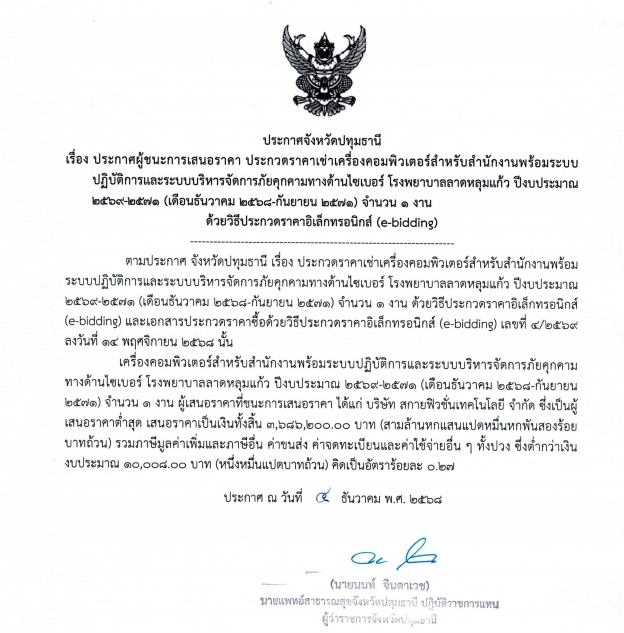 ประกาศผู้ชนะการเสนอราคา ประกวดราคาเช่าเครื่องคอมพิวเตอร์สำหรับสำนักงานพร้อมระบบปฏิบัติการและระบบบริหารจัดการภัยคุกคามทางด้านไซเบอร์ โรงพยาบาลลาดหลุมแก้ว ปีงบประมาณ 2569-2571
