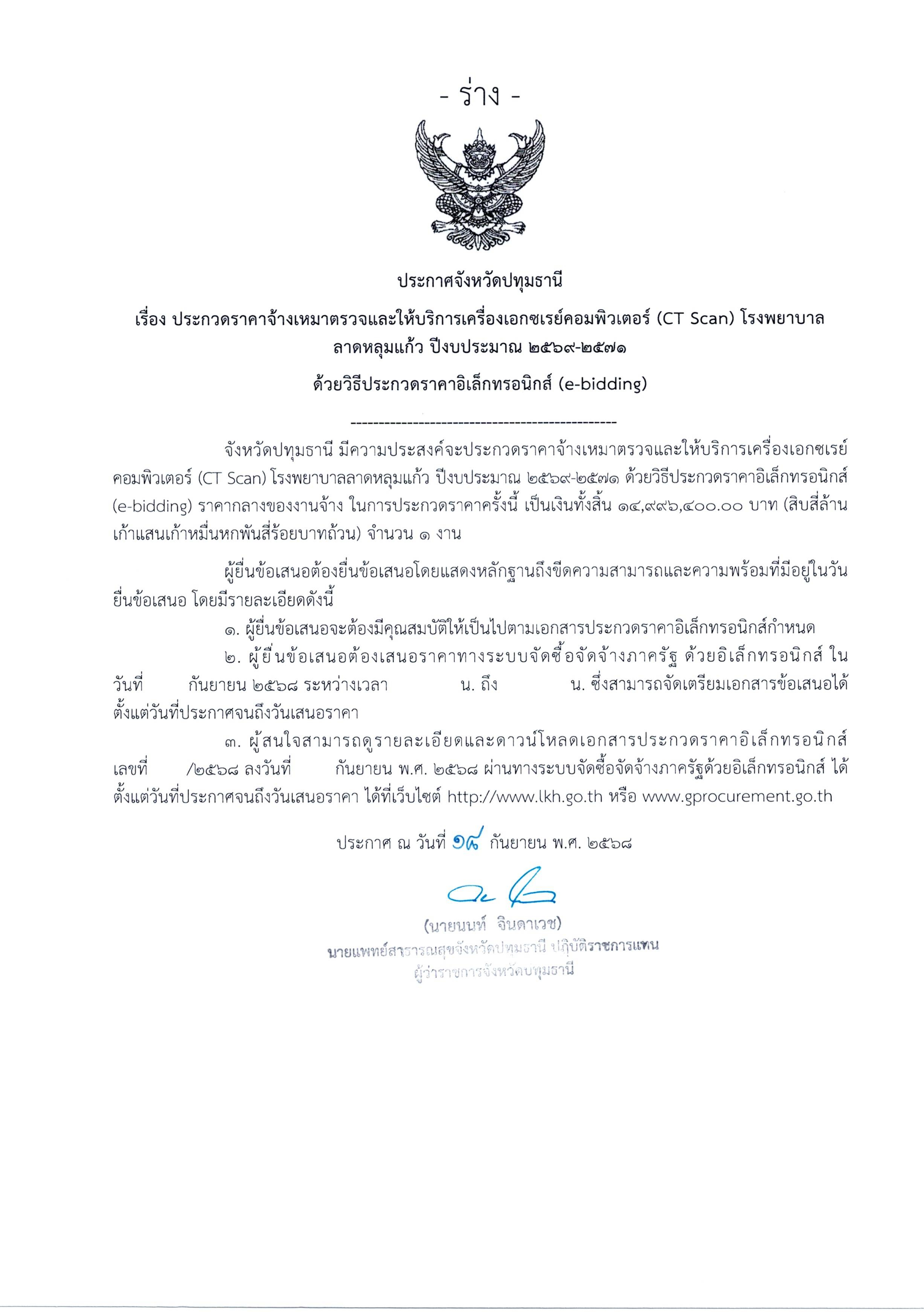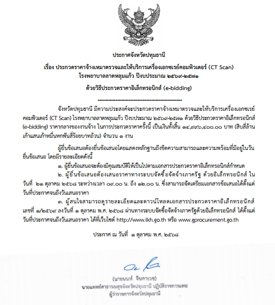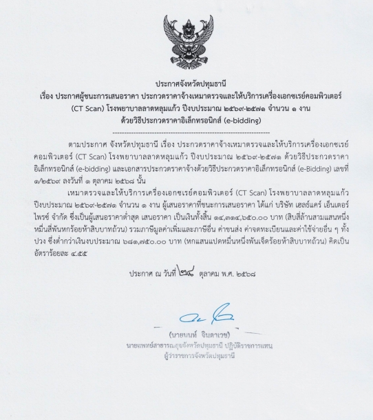 ประกาศประกวดราคาจ้างเหมาตรวจและให้บริการเครื่องเอกซเรย์คอมพิวเตอร์ (CT Scan) โรงพยาบาลลาดหลุมแก้ว ปี