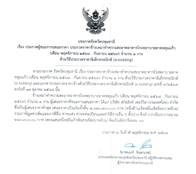ประกวดราคาจ้างเหมาทำความสะอาดอาคารโรงพยาบาลลาดหลุมแก้ว